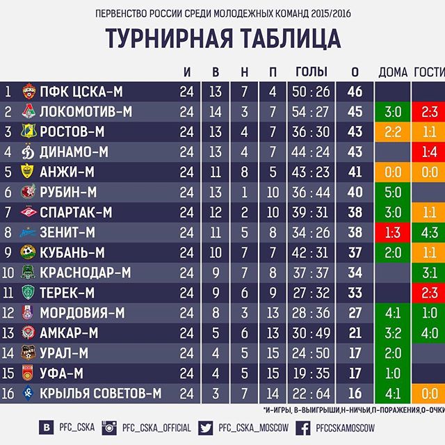Турнирная таблица первенства России по футболу среди молодежных команд после 24 тура #ЦВБП #ЦСКАнавсегда
